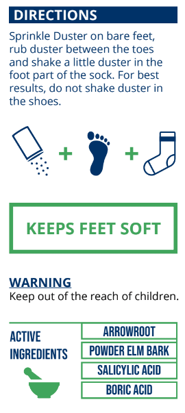 Sprinkle duster on bare feet, rub duster between the toes and shake a little duster into the sock.